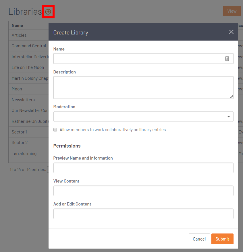 NOTE: Libraries associated to a discussion inherit their moderation setting and view permission from that discussion. If you want to change these settings for a community library, you must edit its associated discussion. See Discussion List to learn how.