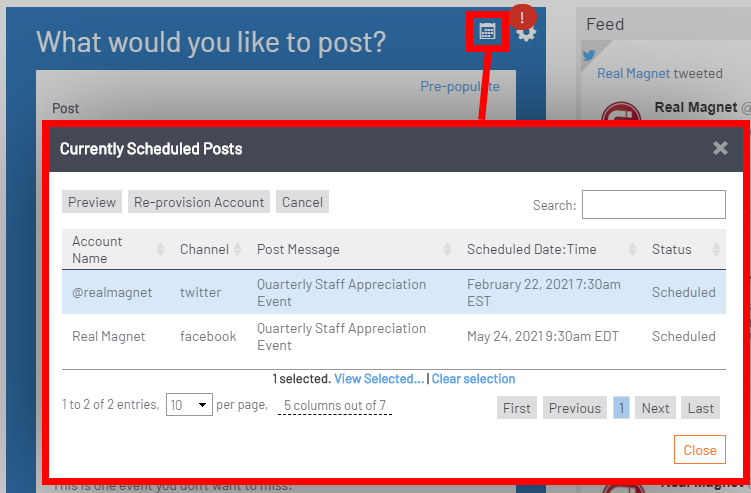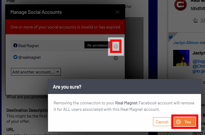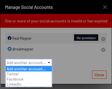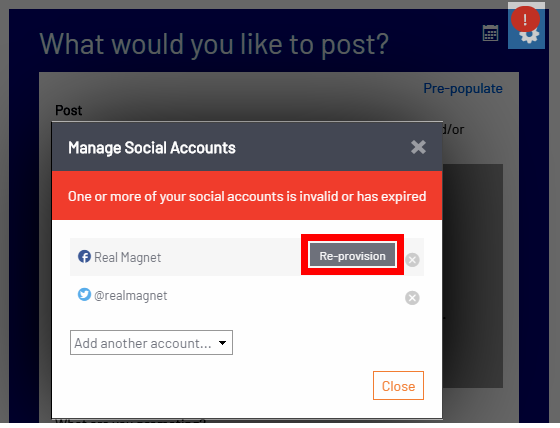 When an account has to be re-provisioned, a red exclamation mark displays on the gear icon and the Re-provision button displays next to the account in the Manage Social Accounts dialog.