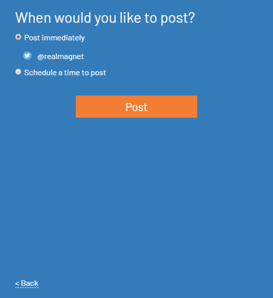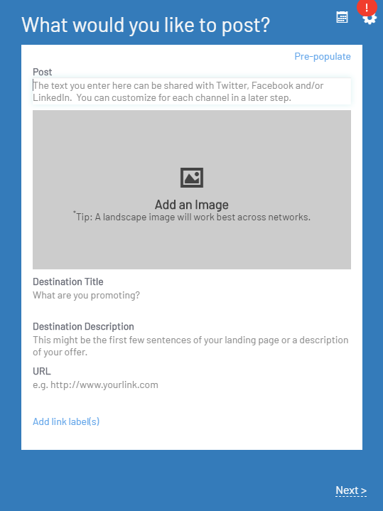 - Click into the Post, Title, Description, and URL fields to update them with the desired information. The text you enter in the Post field can be shared with Twitter, Facebook, and/or LinkedIn, and you can even customize it for each channel further into the process. When finished, click Next at the bottom of this area to continue.