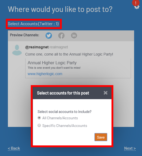- If you want to post your message to multiple social channels, click the Select Accounts link at the top. In the dialog, select the option that meets your needs: post to all channels or select specific channels. A preview of how your content will look for each channel is provided in the Preview Channels area. Click the icons for each channel to view them.
