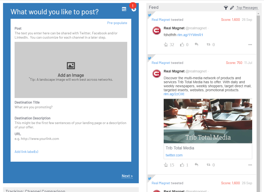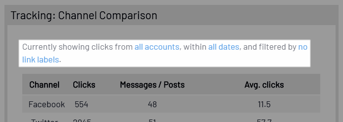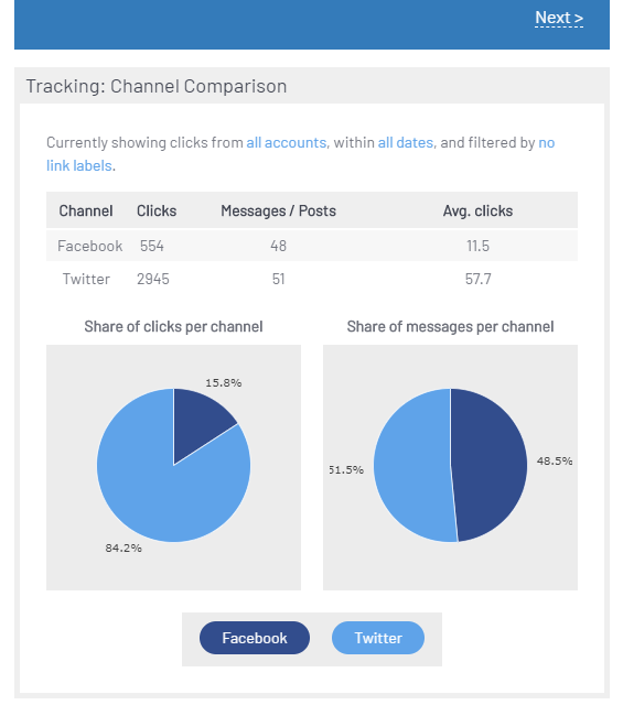 The Channel Comparison report provides an overview of clicks and shares for your posts across Twitter, Facebook, and LinkedIn, and allows you to see which channel has the most engagement.