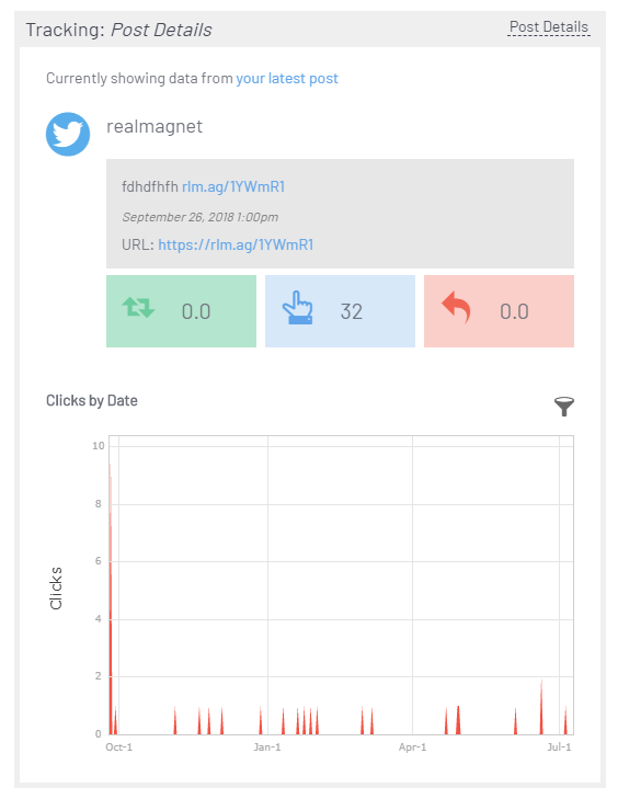 The Post Details report provides data for an individual post. Click the funnel icon to filter the data by date.