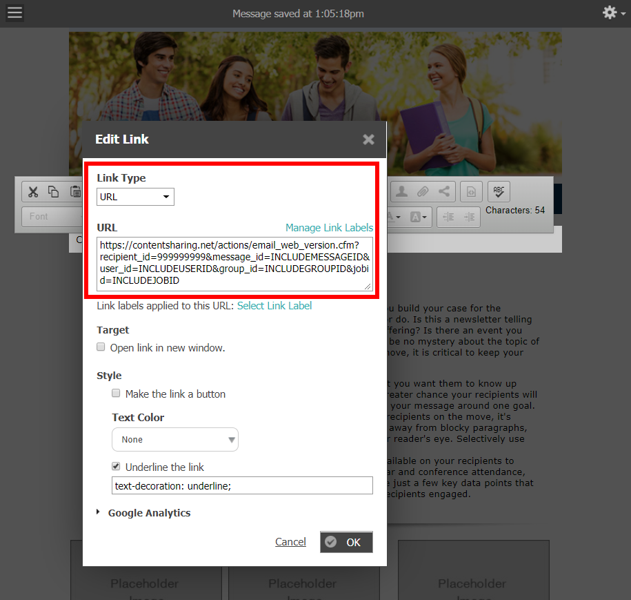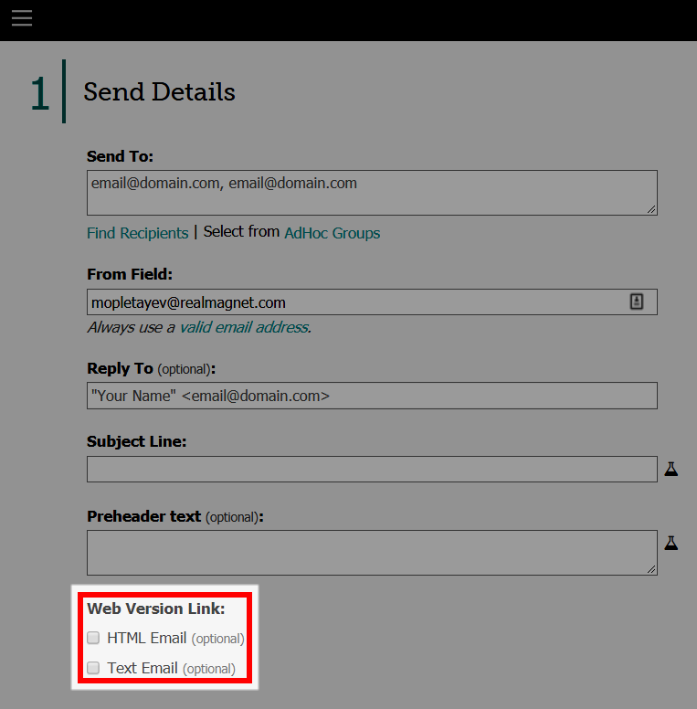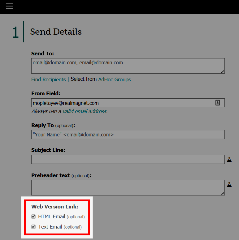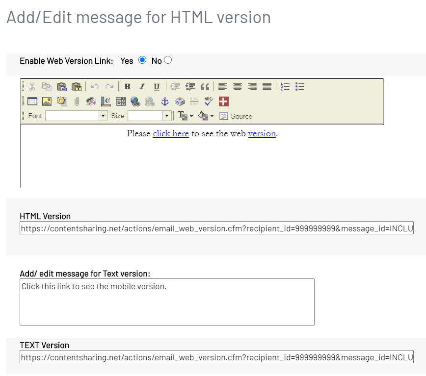 NOTE: Keep in mind that if you've also set up a default mobile link, you'll want to ensure the Web Version Link options, HTML Email and Text Email, are disabled when sending this message (these options control whether the default link is included). If you don't, your message will include your manual link and the default link.