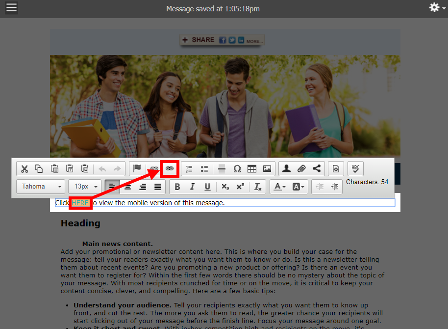 - Add and format the text of the mobile link (e.g., "Click HERE to view a mobile-friendly version of this message.").
