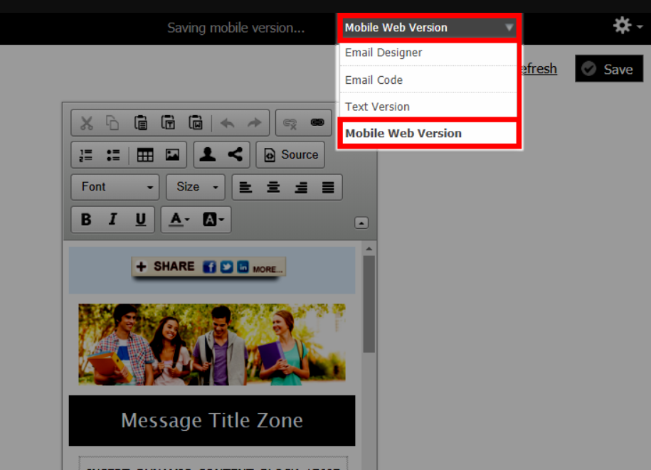 The Message Editor makes it easy to create a mobile-optimized version of your messages. While editing a message in the editor, select Mobile Web Version from the Message Version menu to see the mobile version of your message.
