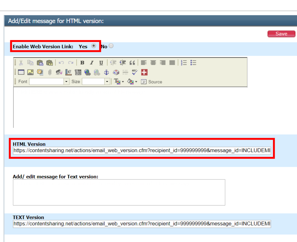 - Set the Enable Web Version Link to YES (this is required for the default and manual links).