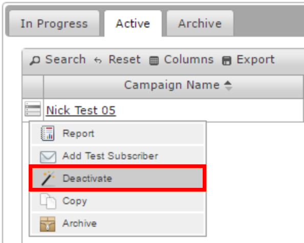 - This places the campaign on "pause;" no one can move forward within the campaign flow until the campaign is reactivated.