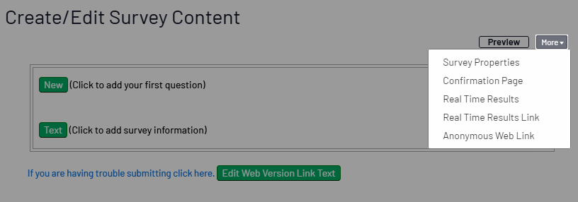 - On the Create/Edit Survey Content page (and a few other survey pages), click More > Survey Properties in the upper right.