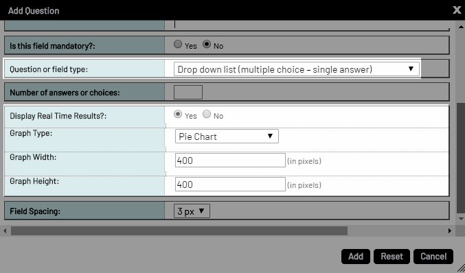 EXAMPLE: If you add the Drop down list question type, you'll notice the Display Real Time Results? option appears. Set this to Yes to track this question in Real Time Results. When enabled, you'll also notice additional options display allowing you to choose the Graph Type (you can choose a pie chart, vertical bar chart, or horizontal bar chart) and set Graph Width/Height (in pixels). Make your selections and click the Add button.