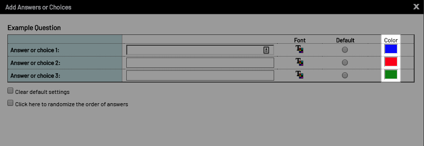 When configuring the answers to your answers, the color that will represent the data for each answer is shown in the Color column. To modify the color, click the color square and select a new one in the pop-up.