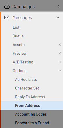 NOTE: If the Enterprise feature is enabled in your account, From Fields (Pre-defined From Field) can be set as a configurable Enterprise asset. In the Admin interface, this feature might also be referred to as Predefined From Field, Pre-defined From Field, and From Field.