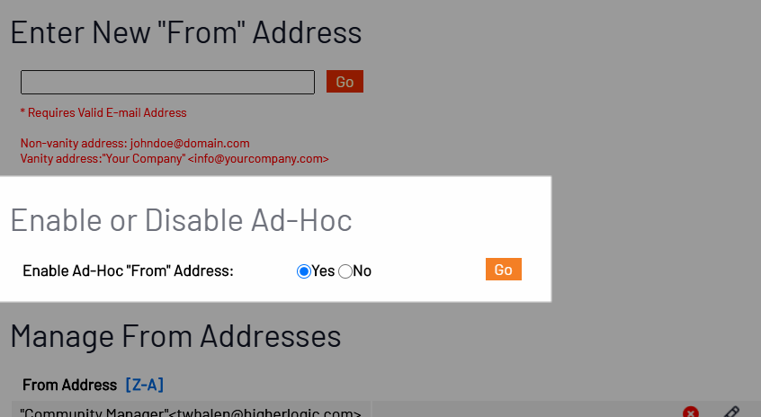 The From Address is the email address you want displayed to your Contacts in the “From” field of an email message. This information is mandatory for every message that is sent from the Higher Logic system, but you can create custom From Addresses that will be available from a dropdown when your account's users are creating email messages.