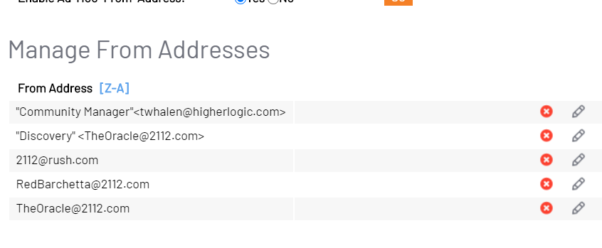 - Outlines the sorting and management features for organizing and viewing From Addresses in the admin interface.
