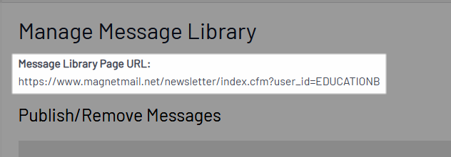 The upper portion of the page lists the URL of your account's Message Library. You can copy the URL and paste it into the browser address bar to access the Message Library.