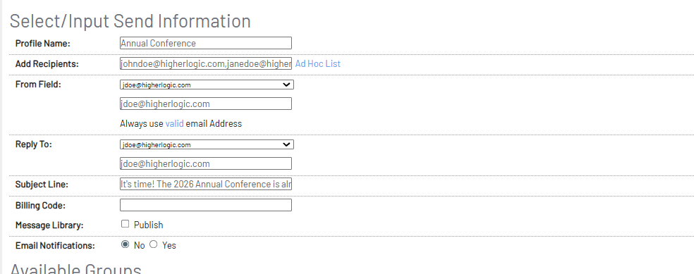 | Subject Line | Use the dropdown to choose one of your account's pre-defined Subject Lines or specify/edit the subject line in the text field. |