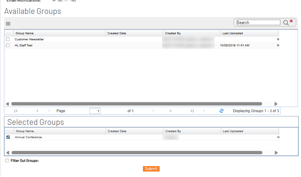 In this section, add and/or remove groups by checking/unchecking their boxes in the Available and Selected sections. As you select groups in the Available section, they automatically move to the Selected section.