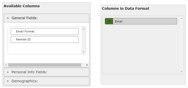 - All of the fields (General, Personal Info, and Demographics) that are added to Columns in Data Format for the Data Format display in the Fields column. This is described in Create a Data Format, below.