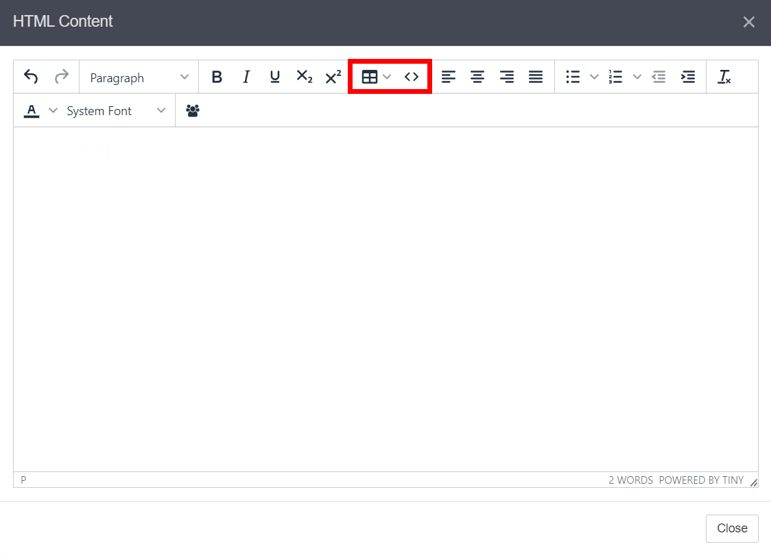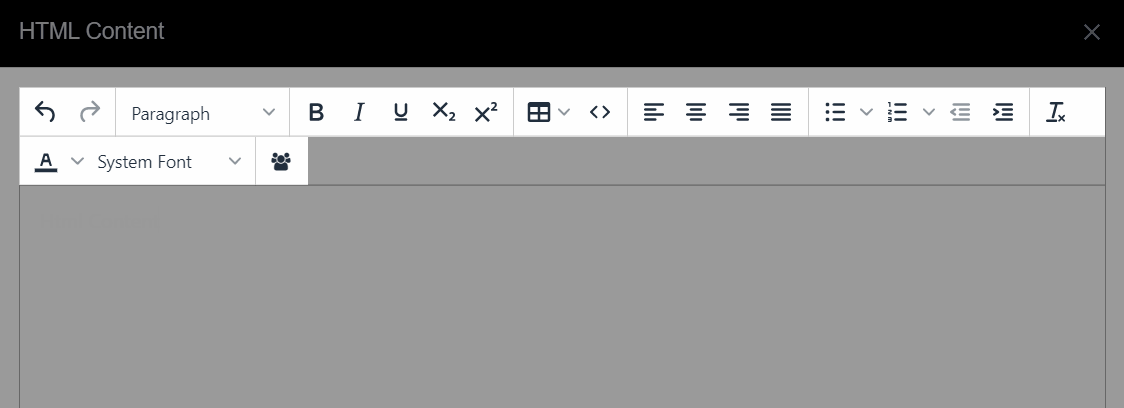 The editor opens and you can now add your content. Refer to HTML Content Editor options, below, to learn about the editor's toolbar features and formatting options.