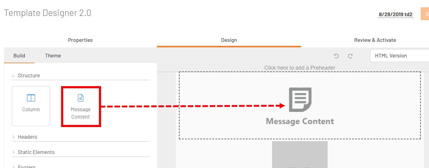 - From the Structure section, drag a Message Content block and drop it onto the template canvas.