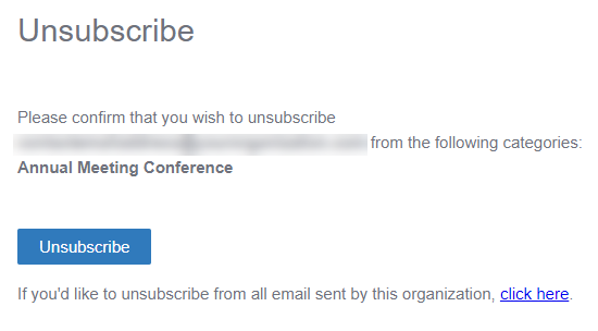 - A confirmation page displays the unsubscribe details. The Contact must then click the Unsubscribe button to confirm the action. This additional step blocks spam filters from causing the issues mentioned previously.
