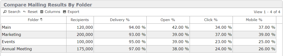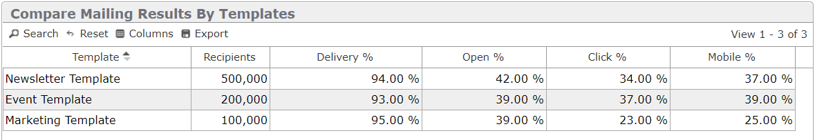 The reports that are available in the Compare Mailing Results group make it easy to compare the performance of your mailings based on various properties and commonalities (e.g., the template they're built on and the send day). You can then use your findings to determine whether your current practices are still effective or whether they should be adjusted.