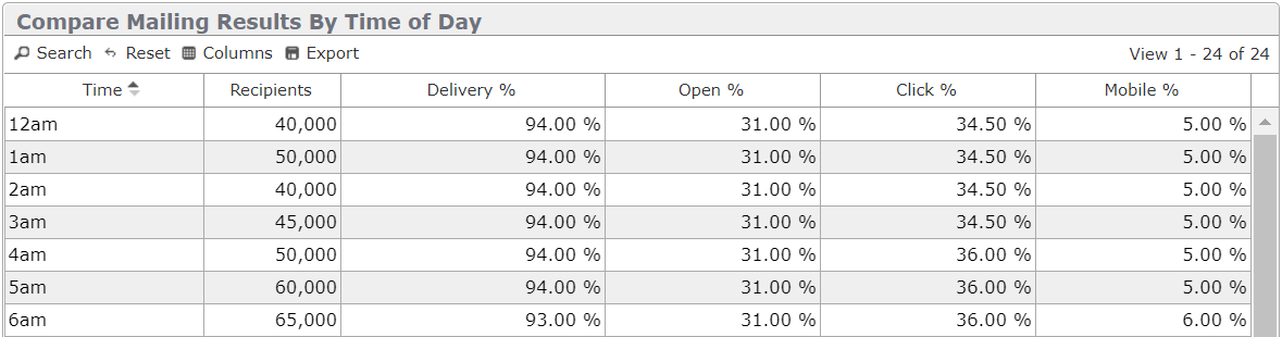 Use this report to see what time of day's mailings get the best recipient engagement (the open and click rates).