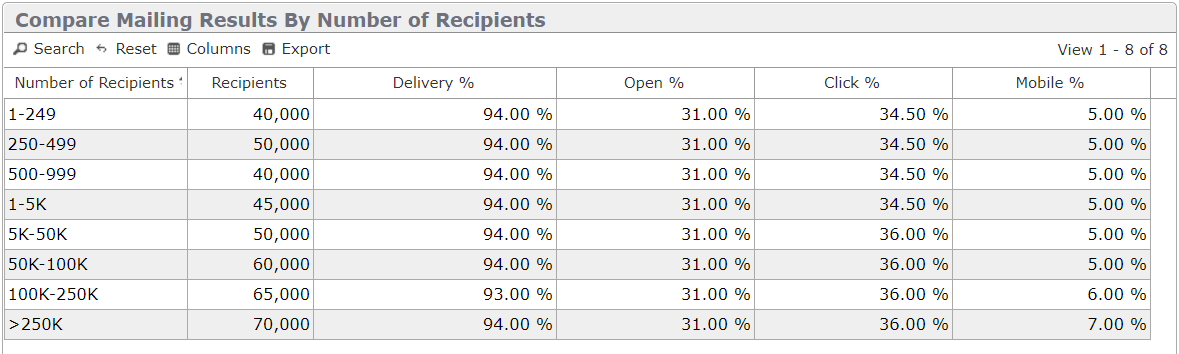 Use this report to determine whether there's any correlation between the number of recipients that a mailing has and the mailing's performance. If there is a correlation, the size or the content of the mailings that are sent to different sized groups could be influencing the mailings' performance.