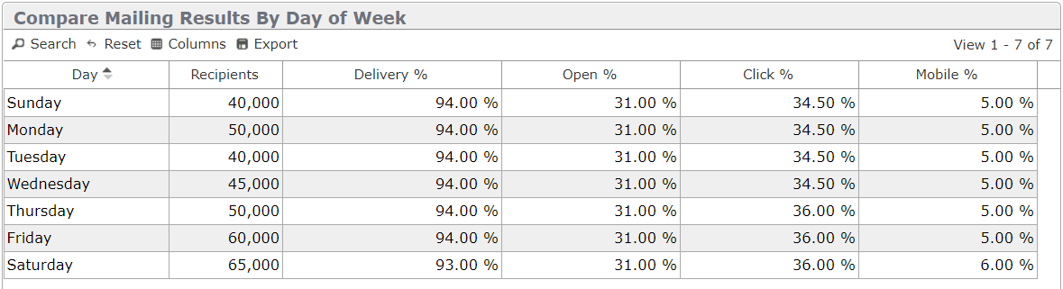Use this report to see which day of the week's mailings get the best recipient engagement (the open and click rates).