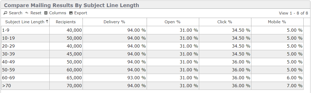 Use this report to determine whether there's any great engagement disparity as regards the length of your mailings' Subject lines.