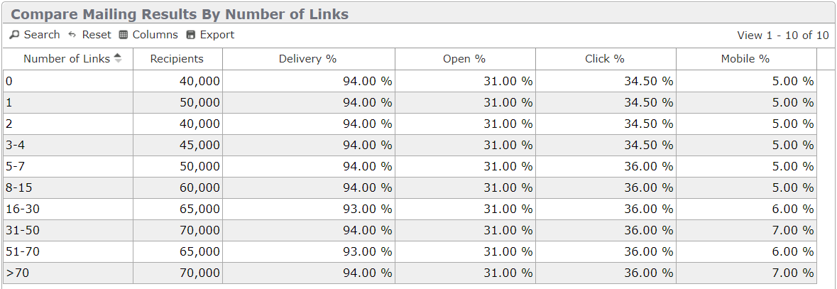 Use this report to determine whether there's any significant difference across your mailings based on how many links each contains. If there is a correlation, consider how many links are in your mailings and, if this seems to be influential, consider increasing or reducing the number of links.