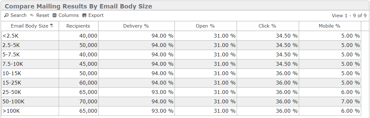 Use this report to determine whether the amount of content in your mailings might influence whether and how your recipients engage with those mailings. If a trend does seem to be present, review your mailings and consider increasing or reducing the amount of content, while ensuring that each mailing is tailored to meet its objective.
