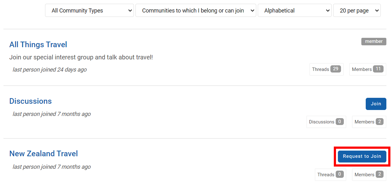 In the example below, I'm viewing the "all communities" page, allowing me to view all of the communities I can join. As you can see, I can join the Discussions community immediately by clicking Join; however, the New Zealand Travel community is a Request to Join community, so I need to go through the formal process to obtain membership.