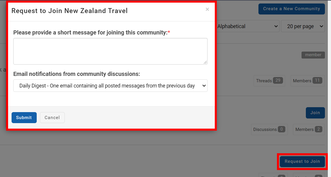 - Click its Request to Join button, whether on the "all communities" page or when viewing the community itself.
