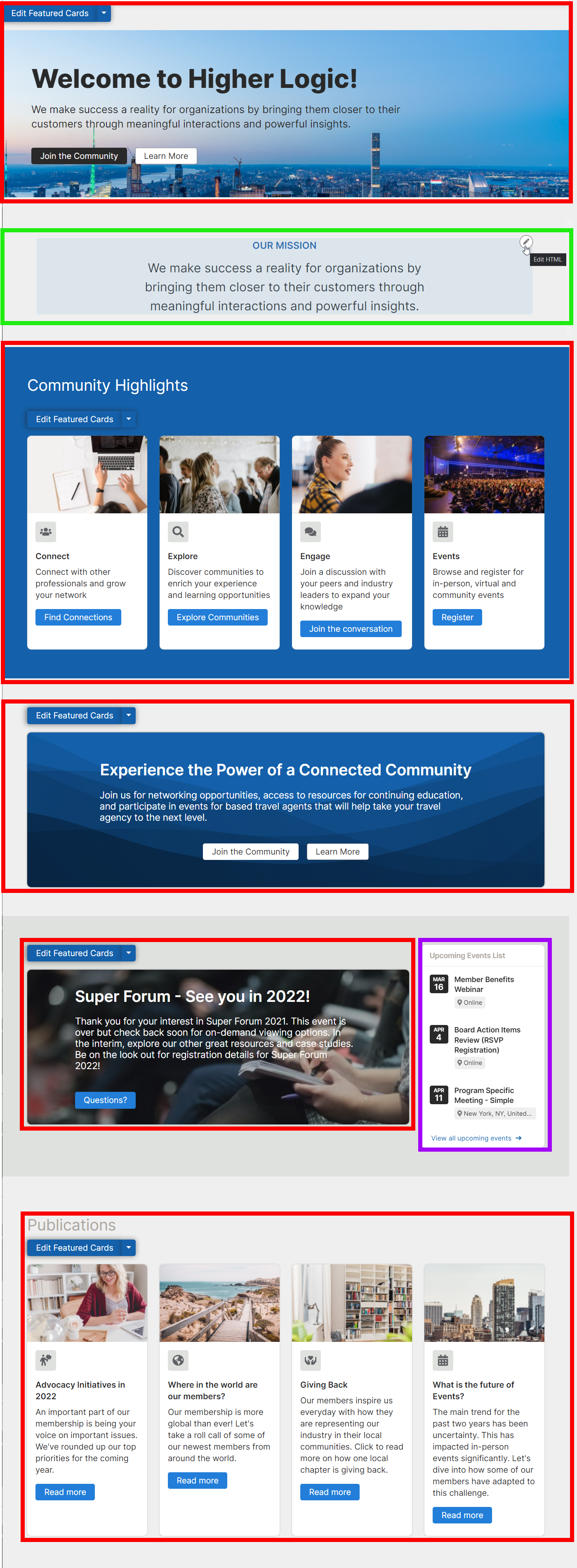 - Featured Cards widget - This widget makes up six of the seven total widgets. Site and Super Admins can update the images, text, and buttons in each of these widgets directly on the page by clicking Edit Featured Cards. See Widget Spotlight - Featured Card to learn how to manage this widget.
